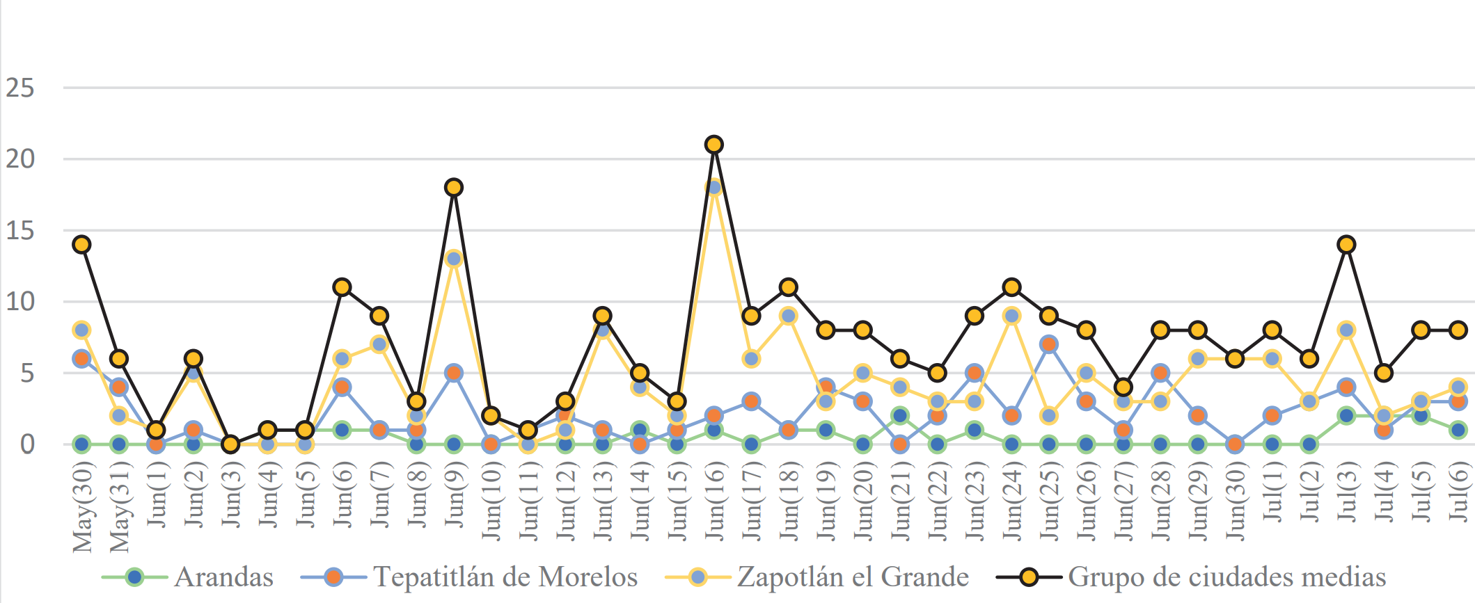 Tres de las ciudades medias de Jalisco que ejemplifican los problemas en este grupo son Arandas, Ciudad Guzmán (en el municipio de Zapotlán el Grande) y Tepatitlán de Morelos, en Los Altos. En estos municipios los contagios del COVID-19 iniciaron el 24 de abril, cuando Tepatitlán registró su primer caso, pero Ciudad Guzmán y Arandas tuvieron su primer caso hasta el 10 y el 11 de mayo, respectivamente. Ciudad Guzmán (Zapotlán el Grande) ha impulsado la dinámica mostrada por este grupo con picos los días 9, 16 y 24 de junio y el 3 de julio, cuando registró 13, 18, nueve y ocho casos, respectivamente (gráfica 10).
