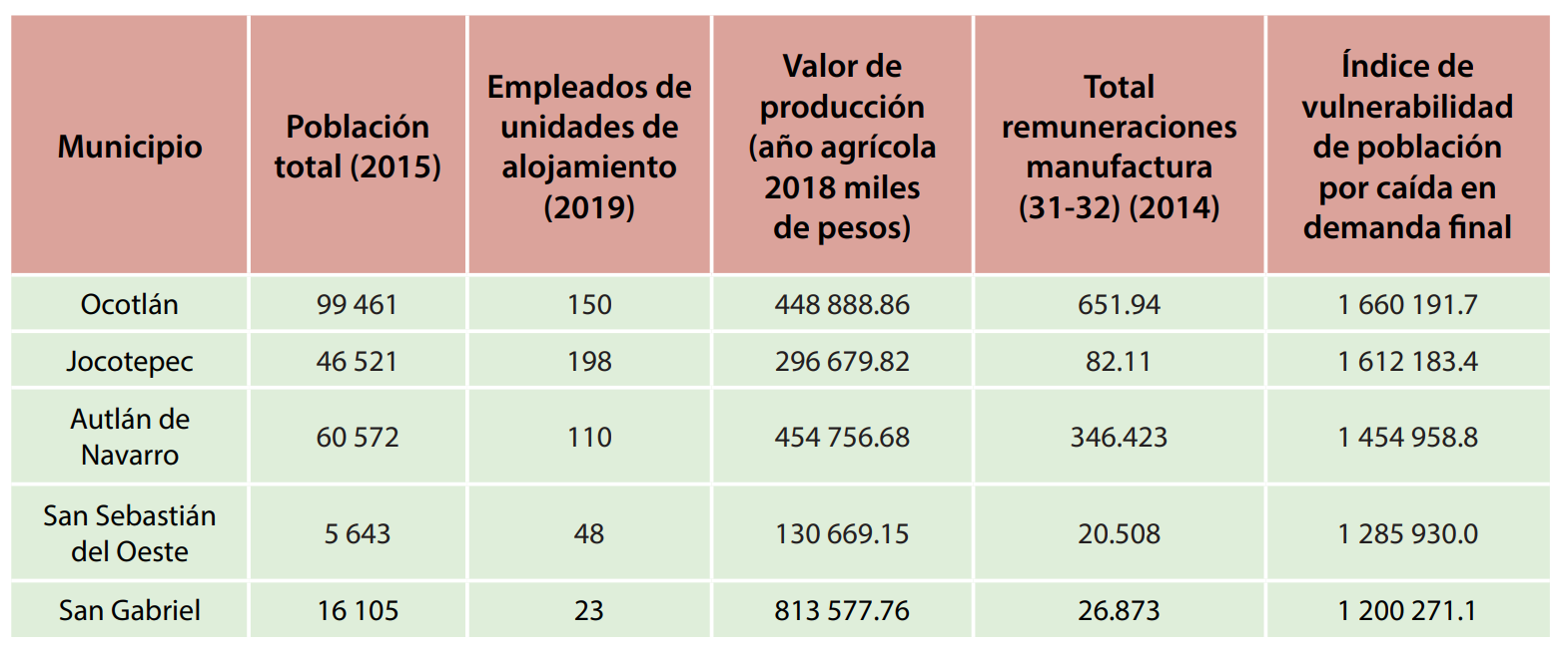 En este caso, las economías locales más vulnerables son las metropolitanas, con Puerto Vallarta a la cabeza, seguido de seis municipios de la zona metropolitana de Guadalajara y tres ciudades medias, una de las cuales (Chapala) es también uno de los lugares con más turismo y retirados extranjeros en el estado de Jalisco. Además de estos lugares, destacan en la tabla de los 25 municipios más vulnerables, centros turísticos como Tequila, San Juan de los Lagos, Talpa de Allende, Cihuatlán y la Huerta.