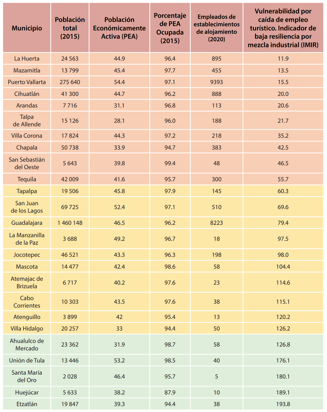Entre los primeros diez lugares de vulnerabilidad se encuentran tres municipios con declaratoria de Pueblos Mágicos (Tlaquepaque, Mazamitla y Tapalpa), dos municipios de la costa sur de Jalisco (Cihuatlán y la Huerta), el principal destino de turismo religioso (San Juan de los Lagos) y Arandas como ciudad media con una importante tradición tequilera. En los siguientes diez lugares se localizan otros pueblos mágicos (Lagos de Moreno, Talpa de Allende, Mascota y Tequila), y lugares de balnearios y recreo familiar cercanos a Guadalajara, como Chapala y Villa Corona.