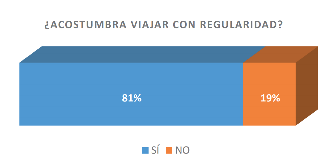 De acuerdo con la información obtenida mediante la encuesta, prácticamente cuatro de cada cinco encuestados manifiesta viajar con regularidad (gráfica 2). Señalaron que sus principales motivos de viaje son el descanso, la recreación y la visita a familiares y amigos, con una reducida proporción viajando por fines de negocios u otros motivos, acompañados básicamente por la familia o pareja.