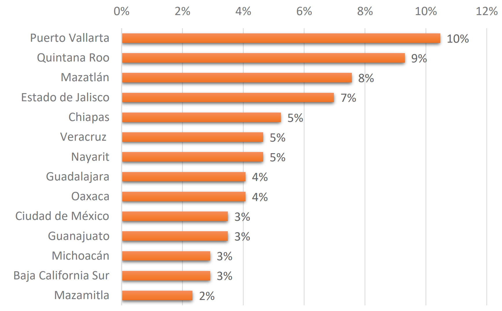 A la par de proporcionar la mayor parte de sus visitantes, Jalisco se presenta como el principal competidor turístico de la entidad, especialmente en la zona de la Bahía de Banderas. El estado de Quintana Roo y el puerto de Mazatlán aparecen seguidamente, como destinos a los que los encuestados viajarían en caso de no decidirse por Colima (gráfica 8).
