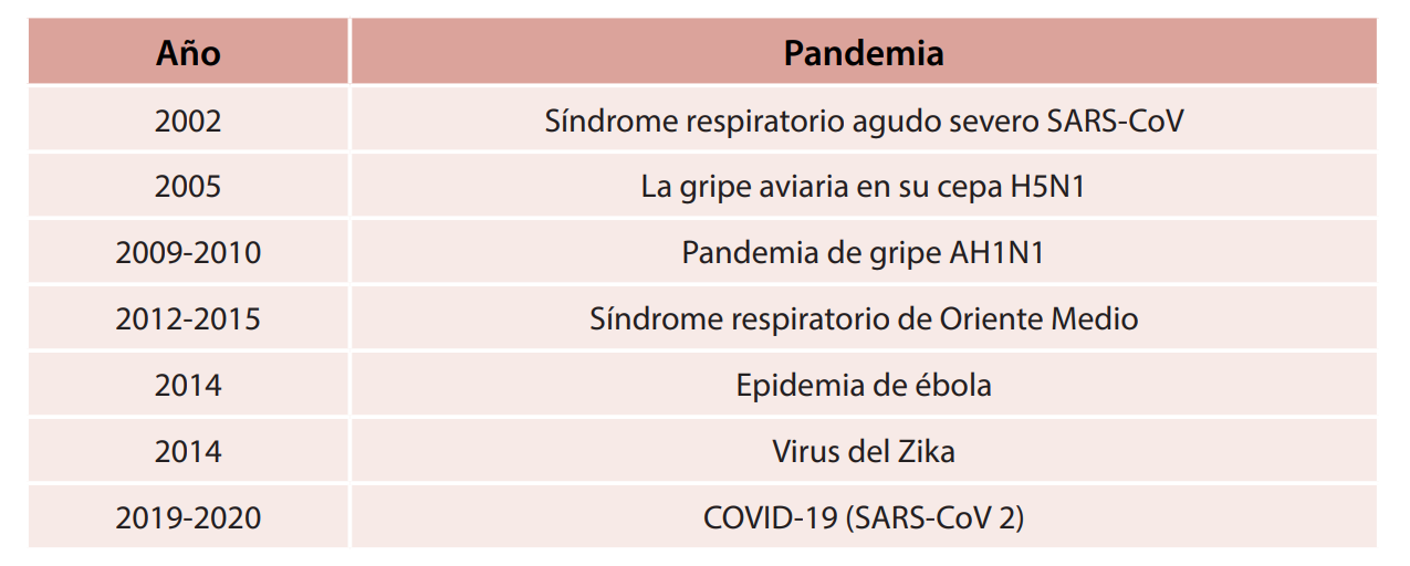 En lo que va del siglo XXI, este tipo de pandemias se ubican como uno de los principales riesgos de salud, resultante de la dispersión de nuevas enfermedades que cruzan fronteras internacionales, afectando a un gran número de personas. En el caso de las gripes, acorde con la Organización Mundial de la Salud (OMS, 2010) se convierten en pandemia cuando surgen nuevos virus que se propagan por el mundo y la mayoría de las personas no tienen inmunidad contra ellos. Se han identificado al menos siete pandemias desde el año 2002 (tabla 1), con impactos en las sociedades y economías de diversas regiones del mundo; de ellas, cinco han sido de origen gripal, del tipo Síndrome respiratorio agudo severo (SARS).
