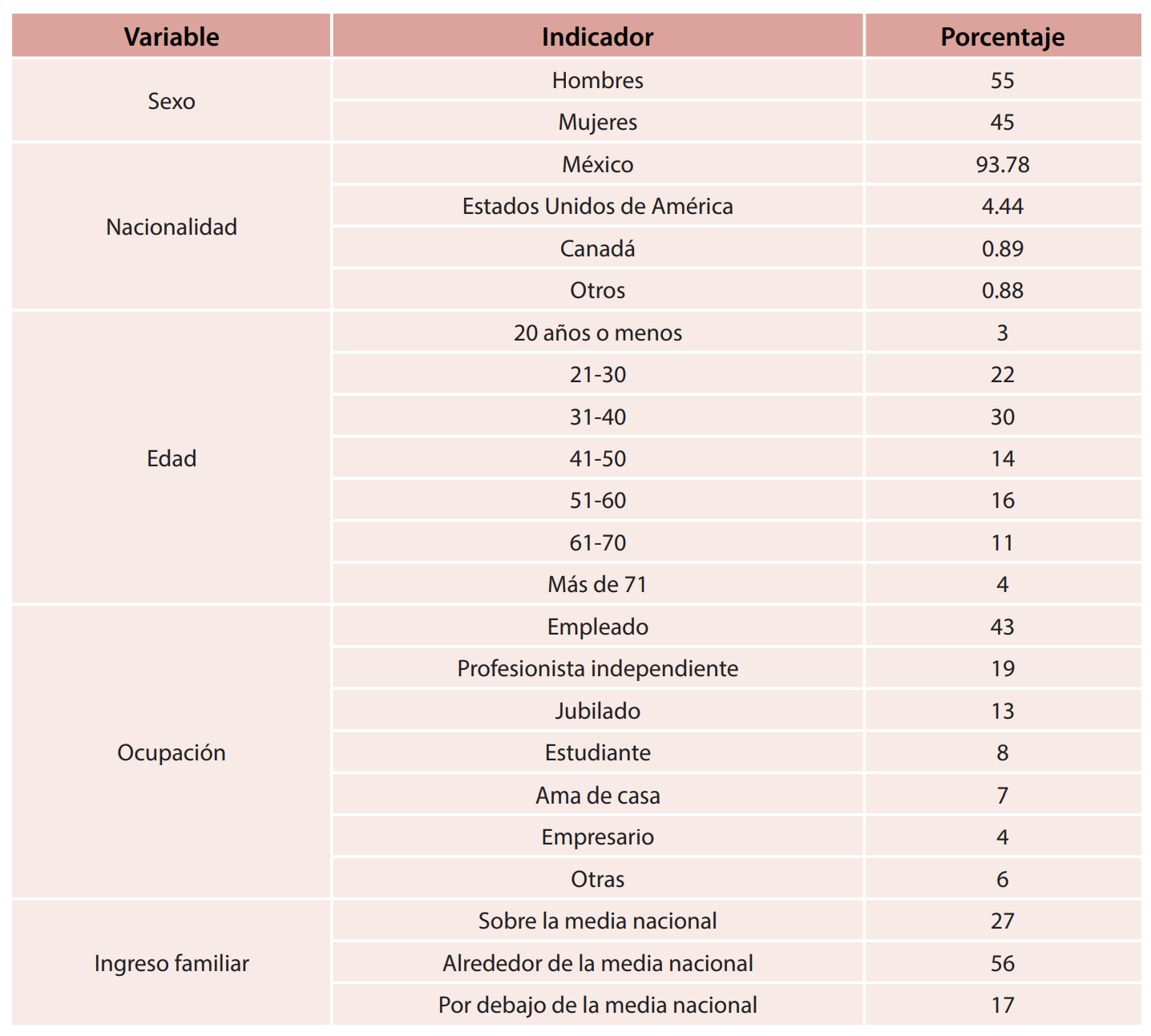 La tabla 3 presenta los resultados sobre el perfil sociodemográfico de los encuestados. Se obtuvo una respuesta relativamente homogénea por parte de ambos sexos (55-45%); se muestra una participación relevante de profesionistas independientes y empleados frente a una proporción reducida de empresarios, con una representación moderada de jubilados, amas de casa y estudiantes.