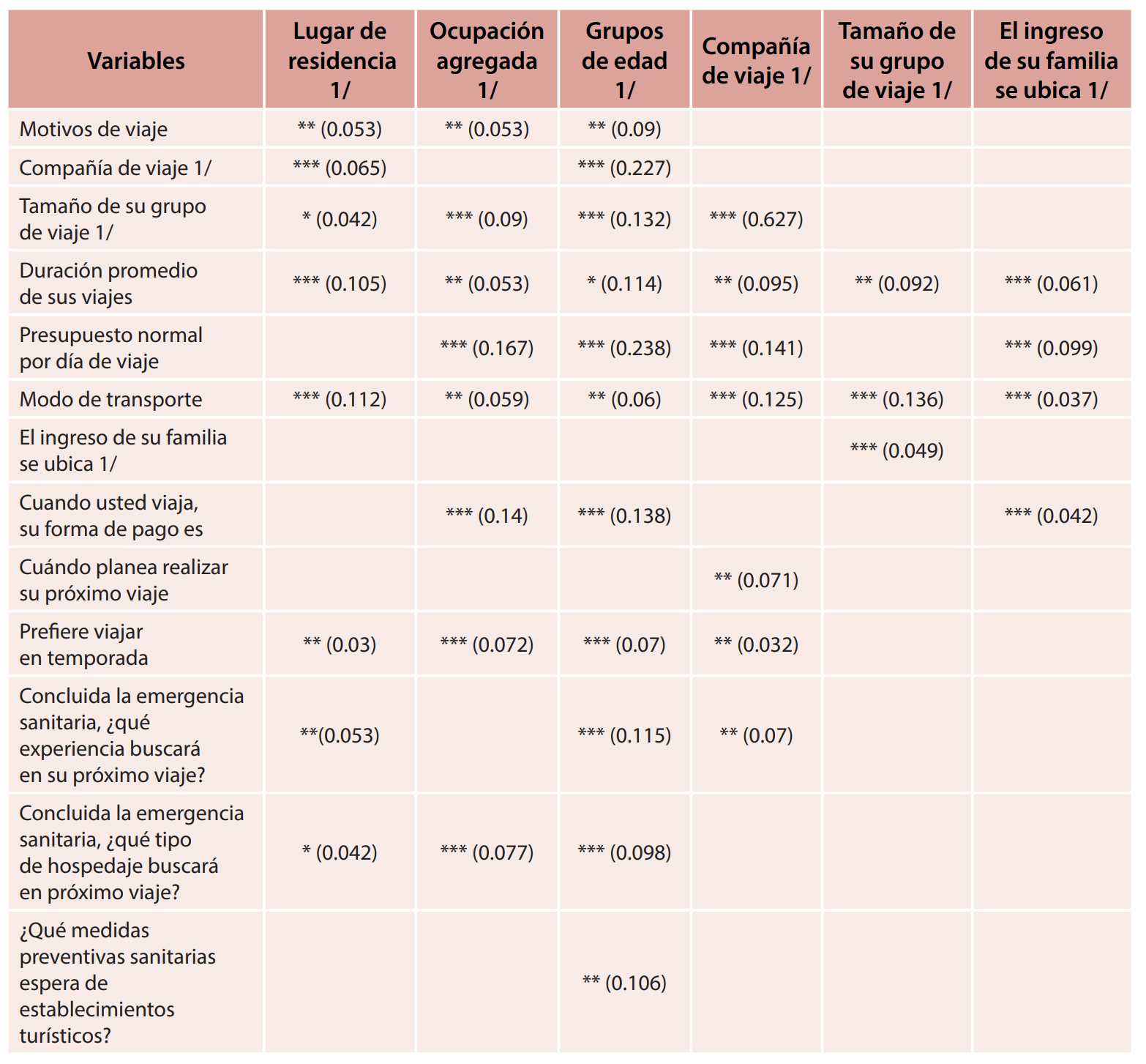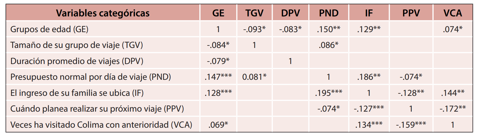 En el campo del AC, las correlaciones más significativas identificadas en las variables analizadas se refieren a aspectos geográficos (lugar de residencia), ocupación, grupos de edad, compañía de viaje e ingreso familiar, presentando un nivel de significancia estadística de 99%. En este mismo nivel, sobresalen los indicadores relativos al tamaño del grupo de viaje, presupuesto diario, medio de transporte y forma de pago. Adicionalmente, se logró determinar otro conjunto de 19 variables e indicadores presentando relaciones con nivel de significancia de 95% y un tercer conglomerado de cuatro correlaciones al 90% (tabla 3). En términos de correlaciones Tau B y C de Kendall, se localizaron 11 correlaciones significativas (52.3 %), aunque con capacidad de predicción reducida (Salvador-Figueras, 2003; Aldás y Uriel, 2017) (tabla 4).