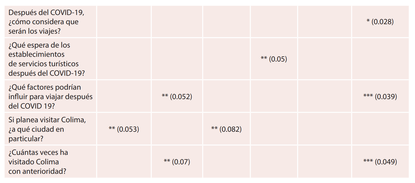 Este trabajo busca conocer las intenciones de viaje potenciales en el área de influencia turística de Colima, México. Se utilizaron 495 cuestionarios que permitieron desarrollar una base de datos a fin de generar información descriptiva y realizar análisis de correspondencias. Los encuestados muestran cautela de viajar frente a los riesgos sanitarios, la situación económica y la inseguridad. El trabajo se basa asimismo en la literatura académica sobre temas de mercadotecnia, manejo de desastres y competitividad turística. Se formulan propuestas para la recuperación de la actividad turística en Colima al final de la pandemia.