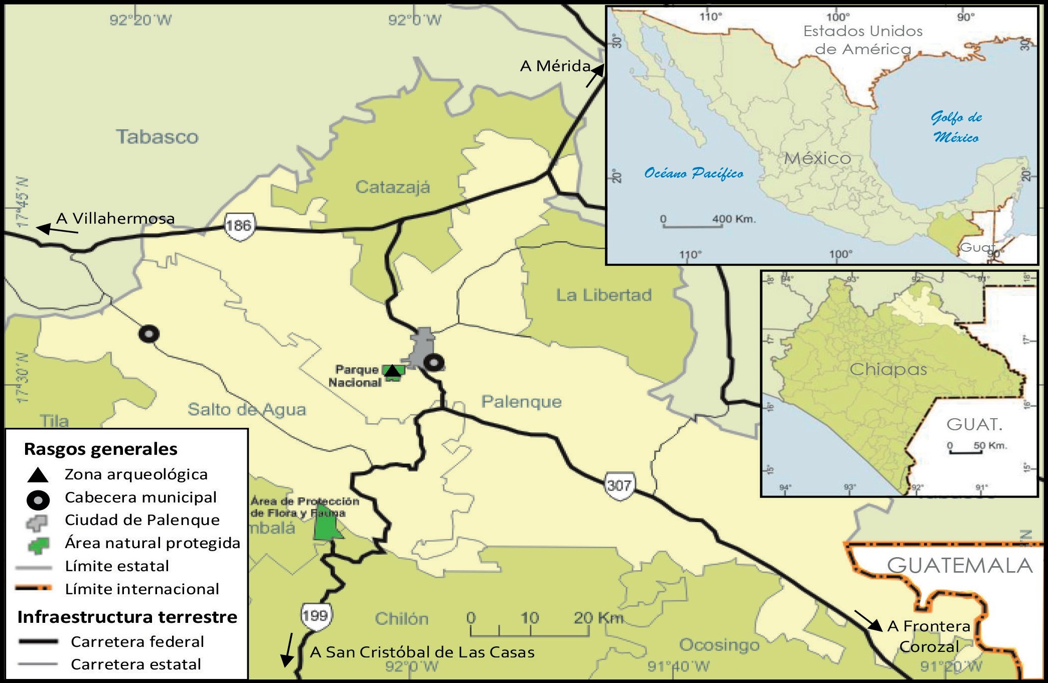 La singularidad del área de estudio con respecto al turismo radica en la zona arqueológica de Palenque, cuyo referente más amplio lo compone la cultura maya, producto ya afianzado en el mercado turístico internacional (Sánchez y Propin, 2010). A esto se agrega que tal recinto es una de las “cunas” del Período Clásico Maya (250-900 d.C.), junto con Tikal, en Guatemala, Copan en Honduras y Calakmul, en Campeche y uno de los centros ceremoniales de mayor extensión, acervo arquitectónico, desarrollo urbano y jeroglíficos en Mesoamérica (Díaz, 2009). En 2017, Palenque captó casi un millón de turistas (920 470) que lo ubicaron como el cuarto sitio arqueológico más concurrido en el país, detrás de Teotihuacán, Chichén Itzá y Tulum (INAH, 2018). Tal contexto ilustra su peso en el mercado turístico nacional y el interés oficial de apuntalarlo como el epicentro del turismo en Chiapas (Fonatur, 2006).