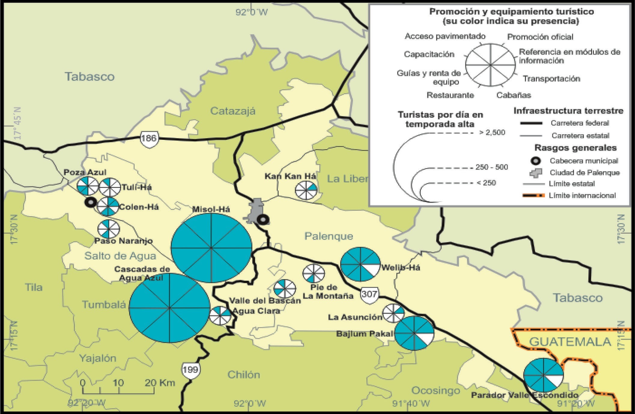De esta manera, la concentración espacial del turismo entorpece su encadenamiento productivo con la economía local. En la ciudad de Palenque, solo las áreas en torno a la cabecera, la zona arqueológica y el aeropuerto poseen un equipamiento urbano y turístico en condiciones óptimas, pero afuera proliferan los asentamientos irregulares por el crecimiento demográfico acelerado de los últimos años. En el ámbito rural aún predominan las actividades agropecuarias tradicionales y extensivas con las que el turismo compite por el territorio y los recursos. En este contexto subsisten 14 centros ecoturísticos entre los que se aprecian diferencias sustanciales en cuanto a equipamiento, accesibilidad y promoción. Solo Cascadas de Agua Azul y Misol-Há, catalogados aquí como centros ecoturísticos primarios, reciben un flujo sostenido de visitantes a lo largo del año, mientras que el grueso de los centros secundarios y marginales apenas tienen accesos y referencia en mapas o sobre las carreteras. Esto condiciona su participación en la dinámica turística y, lejos de conformar un producto integral que atraiga más visitantes y prolongue su estadía, limita la distribución equitativa de los beneficios que aportan.