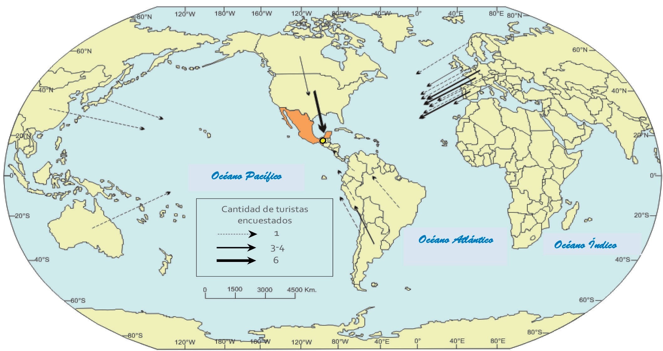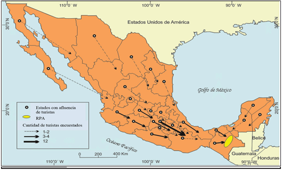 Asimismo, el 76% de los encuestados de origen nacional y todos los extranjeros visitaron, antes o después de la RPA, otros puntos de interés en el Mundo Maya. En consonancia con esta situación, el medio de transporte de todos los encuestados para acceder o salir del área de estudio fue terrestre, lo que evidencia la baja demanda del aeropuerto de Palenque. La explicación subyace en que la RPA conformó, para el 68% de ellos, un destino turístico intermedio en su itinerario de viaje por el sureste mexicano y América Central, que disponen de aeropuertos mejor interconectados con México y otros países; entre ellos, el de Villahermosa, Tabasco, por el que llegó un 18% de los encuestados de origen nacional.