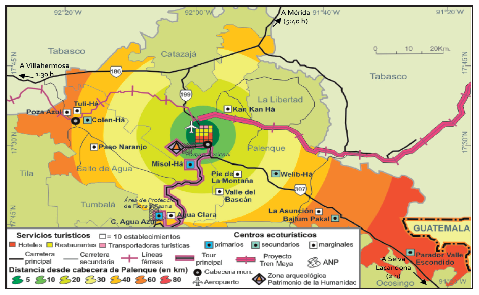 Más allá de su oferta turística, otro factor que explica el crecimiento y dinámica espacial del turismo en la RPA es su posición geográfica y conectividad terrestre con la Selva Lacandona, la Península de Yucatán y Guatemala. Tales ventajas la colocan como un sitio de enlace hacia tales regiones, que se refuerza por los servicios de alimentación, alojamiento, transporte y otros suplementarios en la ciudad de Palenque. Esto parece ser el motivo por el que el área de estudio es la única del estado incluida en una cuarta parte de los tours y paquetes de viaje a la Ruta Maya, examinados para este estudio. Además, la articulación terrestre de la RPA con otros circuitos turísticos en Chiapas y fuera del estado sirvió para proyectarla, a principios de siglo, como un centro de distribución del turismo en Chiapas (Fonatur, 2006 y 2012). Este atributo crecerá con la construcción de nuevos canales de comunicación aérea (a Oaxaca, Cancún y Tikal), ferroviarios (a Mérida y Chetumal con el Tren Maya) y carreteros (autopista a San Cristóbal de Las Casas), en el corto y mediano plazos (Mariscal, 26 de diciembre de 2019).