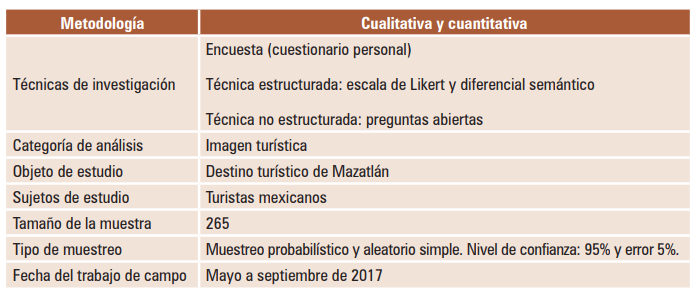 Con la finalidad de dar respuesta a los objetivos planteados, se llevó a cabo una investigación inicial cualitativa y otra, posterior, cuantitativa. Esta primera fase cualitativa consistió en obtener conocimiento e información sobre el tema estudiado. Se efectuó una investigación exploratoria con levantamiento de fuentes secundarias como: la consulta de artículos y de libros sobre imagen-destino que da como resultado el fortalecimiento del marco teórico. La segunda es la cuantitativa, que se fundamenta en una encuesta personal realizada a 265 turistas nacionales, usando como instrumento un cuestionario estructurado aplicado en el destino turístico de sol y playa, tomando como referencia para esta investigación a Mazatlán, Sinaloa.