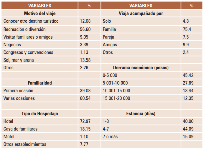 En este apartado se muestran diversos aspectos importantes que determinan el proceso de percepción de la imagen turística por los mexicanos que visitan este destino, a partir de los cuales se obtienen los siguientes resultados: respecto a la frecuencia de visita, la de varias veces presentó el mayor índice con 60.54% y la primera vez con 39.08%. Sobre la permanencia o estancia en el destino el mayor peso es el rubro de 4 a 7 días con 44.09%, la estadía de 1 a 3 días con 40%, por último, el de 7 o más días es de 15.09%.