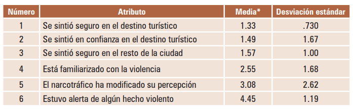 Como se muestra en el cuadro 5, un análisis descriptivo de los atributos cognitivos en la formación de la imagen del destino muestra que la seguridad y la confianza presentada es un escenario favorable para la percepción de los turistas nacionales sobre este sitio. Este hecho lo constata el estudio de Gómez (2010) considerando el lugar de origen del turista. En cambio, el impacto del narcotráfico y la familiarización con la violencia por parte de los turistas no se consideran factores importantes para determinar la imagen turística del destino de Mazatlán.