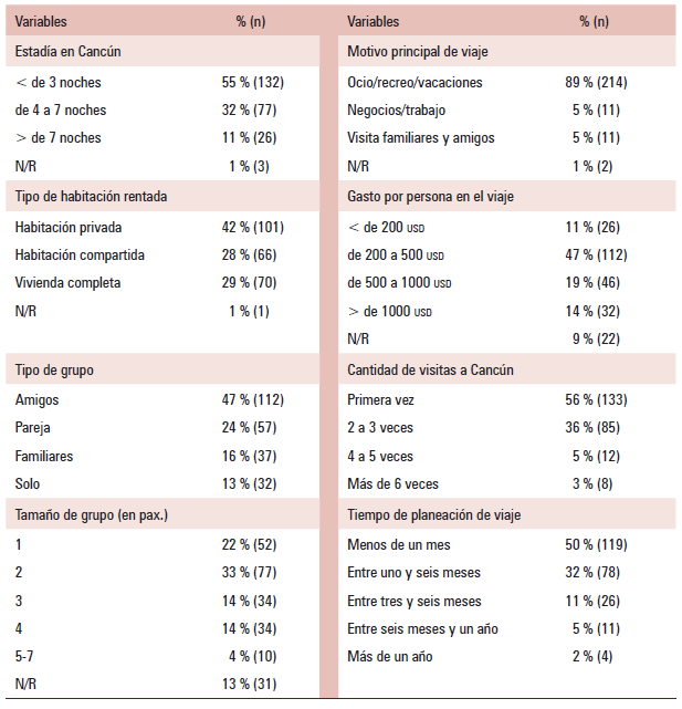 En cuanto al comportamiento vacacional de los usuarios de Airbnb en Cancún, 89 % manifestó como motivo principal vacaciones y 10 % lo repartió, en igual proporción, entre motivos laborales y de visita a familiares y amigos (cuadro 5). Predominan los grupos de amigos (47 %) y las parejas (24 %) que realizan un gasto por persona durante su viaje de 200 a 500 usd, mismo que planean en menos de un mes (50 %). Más de la mitad de los usuarios entrevistados dijo que era la primera vez que visitaba Cancún.