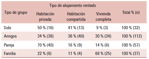 La contratación de las distintas opciones presenta también una distribución bastante lógica según sus necesidades (cuadro 6): familias principalmente casas (68 %), parejas habitación sola (70 %), personas solas habitación sola o compartida, y amigos las tres opciones. Lo llamativo es que, aun cuando sea en un porcentaje menor, hay usuarios para las otras opciones en cada uno de los casos.