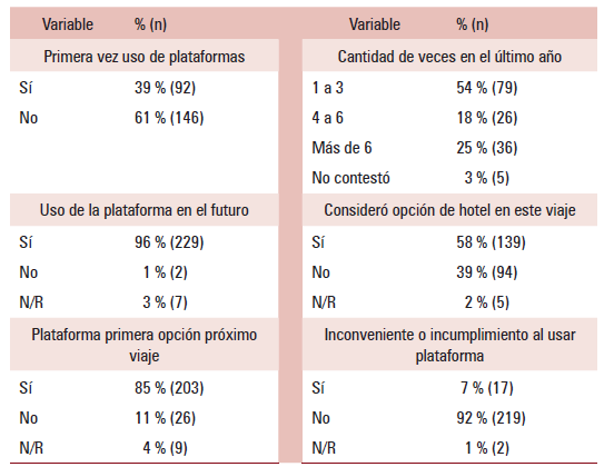 Los resultados del levantamiento de entrevistas semiestructuradas muestran turistas alojados en hoteles que han usado la plataforma en otras ocasiones (35 %), esta significativa proporción parece indicar que el uso de las plataformas responde a las necesidades derivadas del tipo de viaje que se realiza, lo cual contradice la idea de que el turista deja de utilizar alojamiento tradicional una vez que ha experimentado con las plataformas.