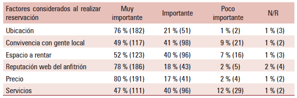 En la literatura y la publicidad se hace mucho énfasis en la experiencia de la convivencia con gente local y de “vivir como local” en el destino visitado; empero, al menos para el caso de Cancún, esto parece no ser el atributo más valorado por los usuarios (cuadro 8). Los tres primeros factores más valorados (precio, 80 %; reputación web, 78 %, y ubicación, 76 %) muestran un consumidor muy racional, contrario a lo que se idealiza. Esto coincide con la percepción expresada por algunos anfitriones participantes en el grupo focal, quienes dijeron que al principio propiciaban mayor convivencia cultural e interacción, pero que con el paso del tiempo fueron disminuyendo las interacciones con sus huéspedes, dada su corta estancia en el destino o para propiciar mayor privacidad.